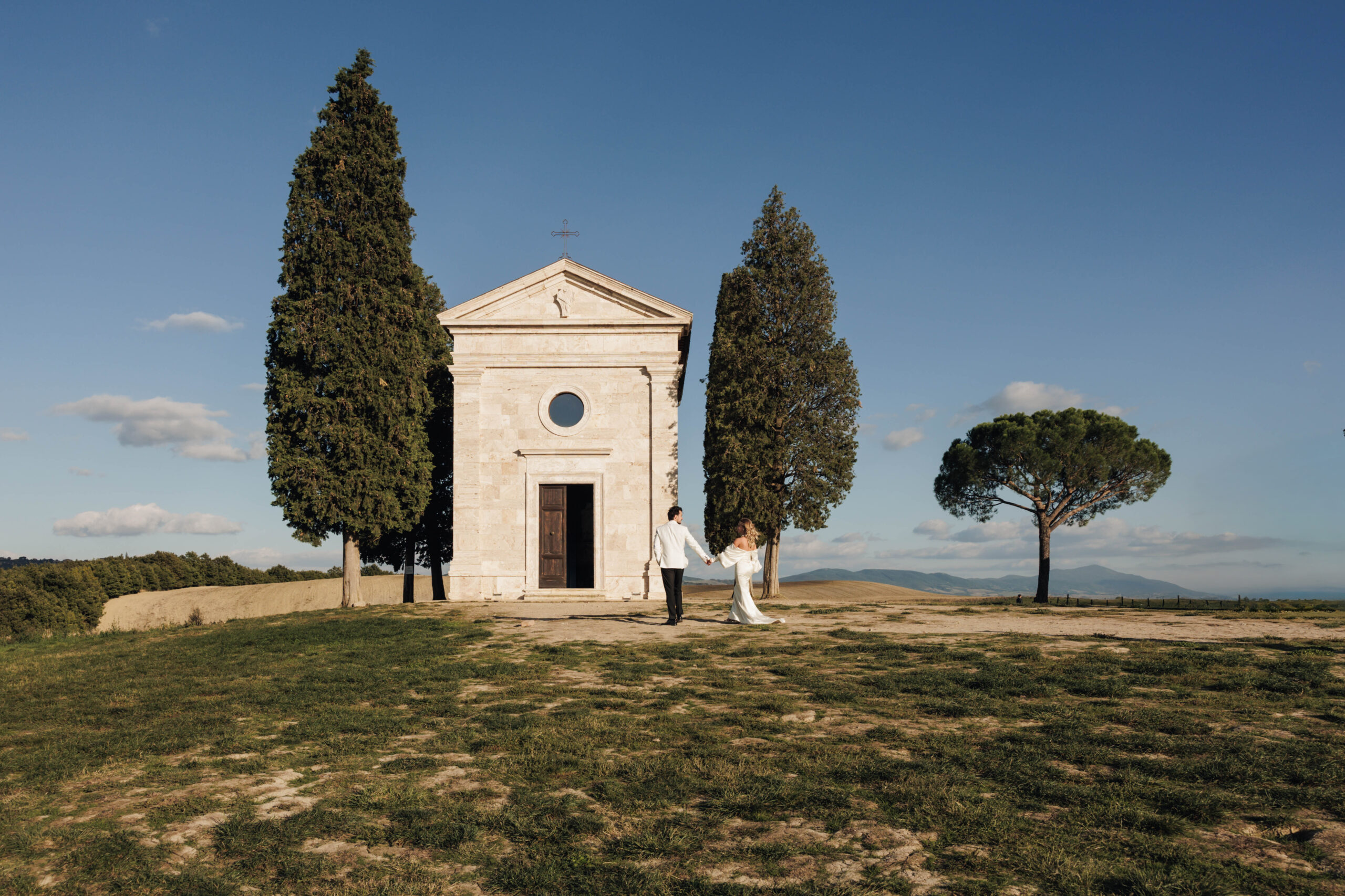 We paused along centuries-old cypress roads, visited a solitary hilltop chapel, and wandered through the famous valley where Gladiator was filmed — arriving just in time to experience golden hour and sunset. Stone villas, hidden pathways, and vineyard views completed the visual narrative, making Val d’Orcia the perfect backdrop for a luxury destination elopement in Italy.